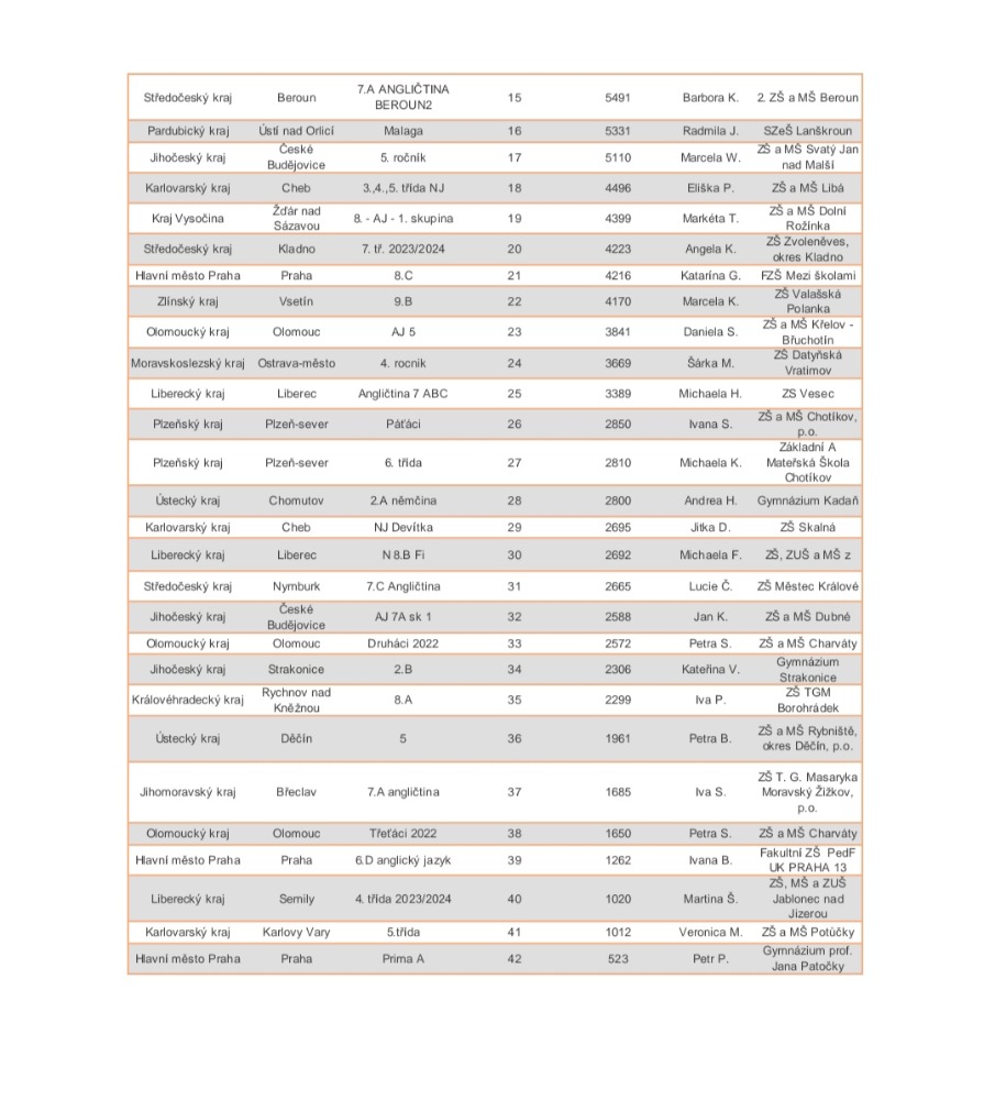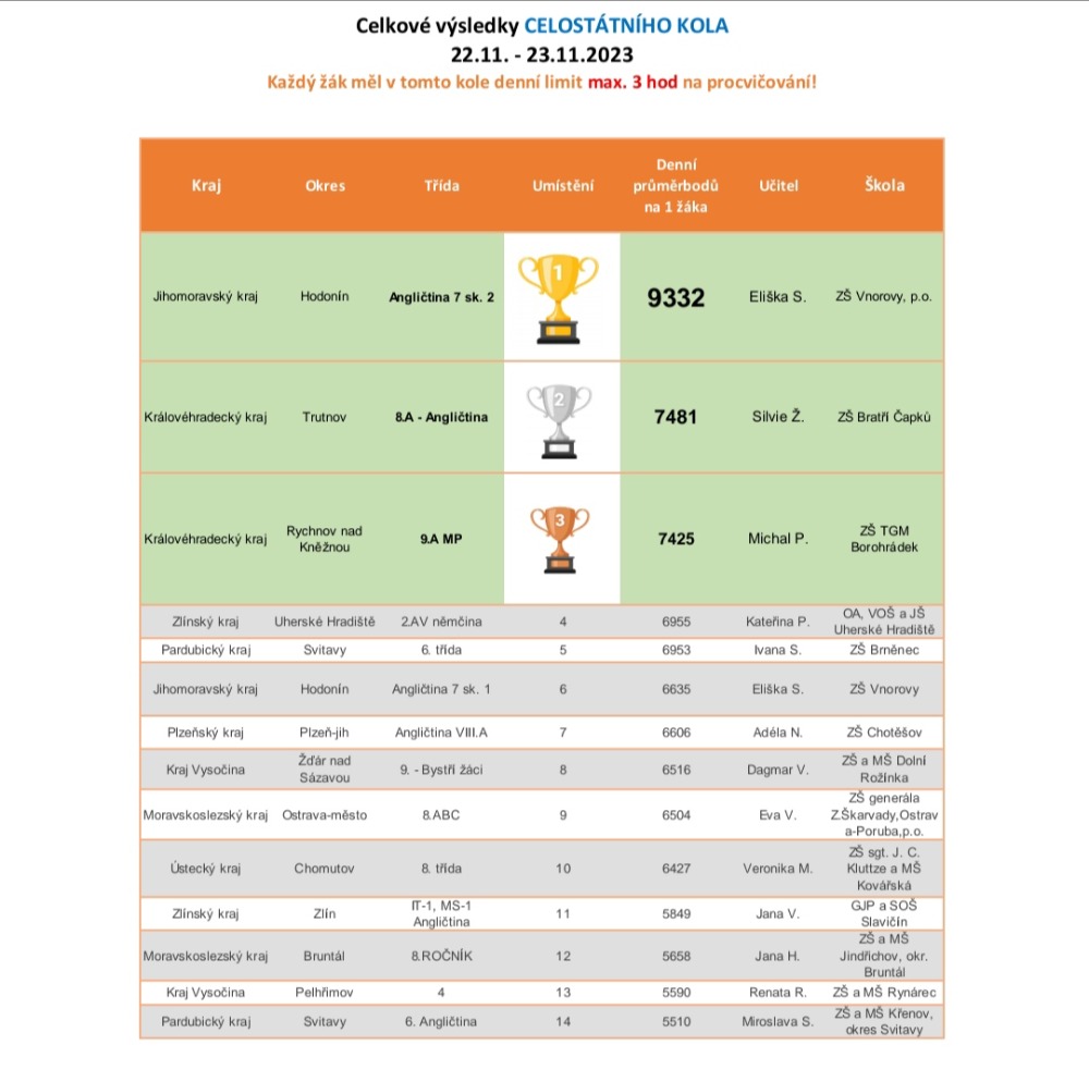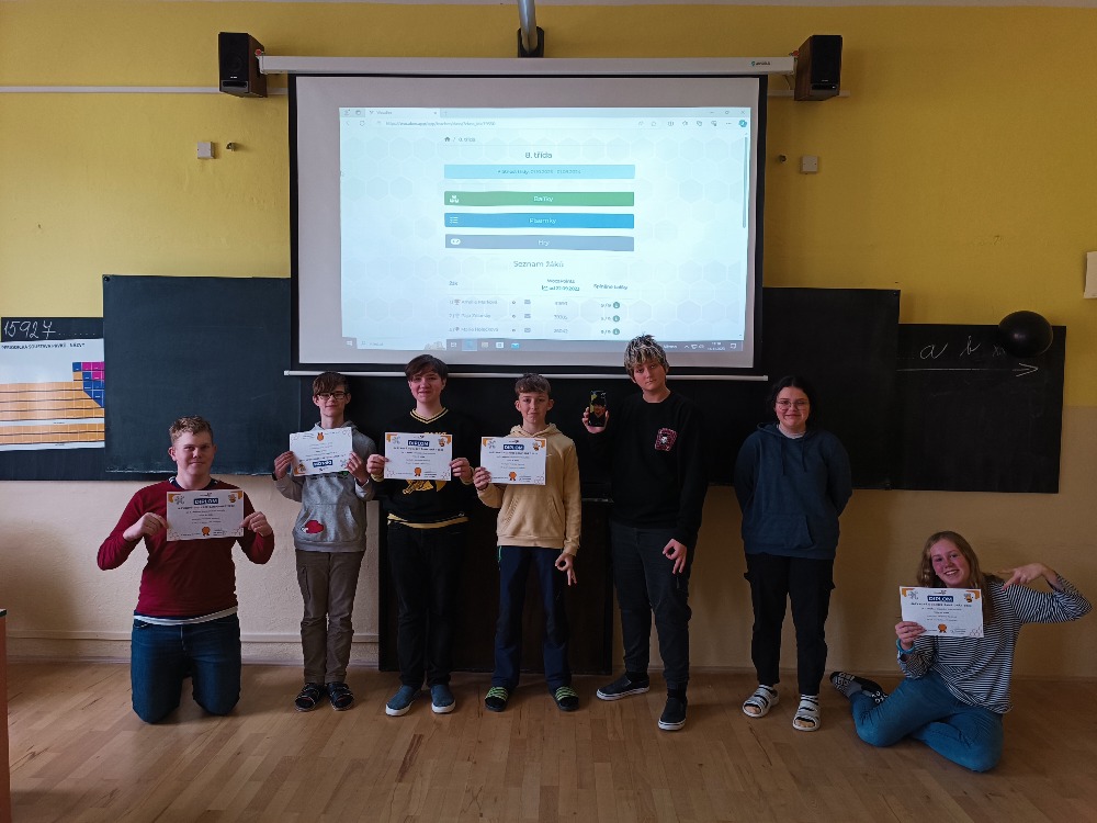 Po dvoudenním boji plném nervů ve státním kole skončila naše 8.třída na krásném 10.místě. A to stále jako první v Ústeckém kraji, nechala daleko za sebou Gymnázium Kadaň i ZŠ Rybniště, okres Děčín. Chtěla bych všem, kteří se moc snažili a bojovali ze všech sil, poděkovat a už teď se těším na další ročník, ve kterém budeme ještě lepší .