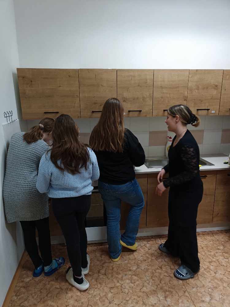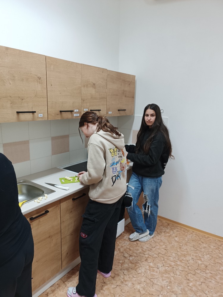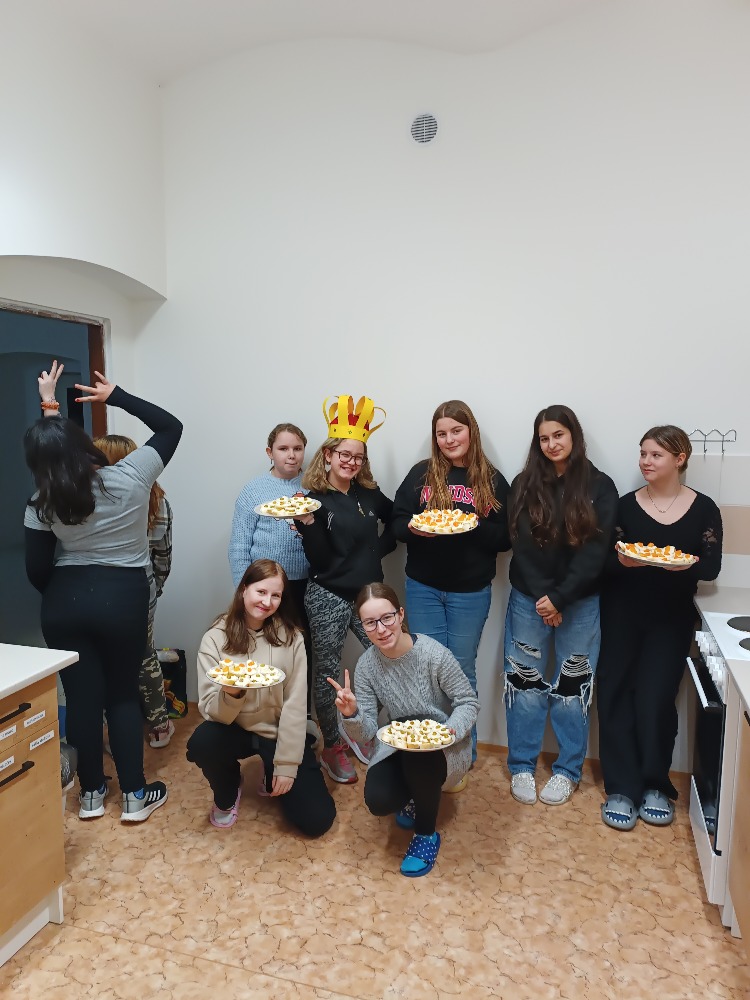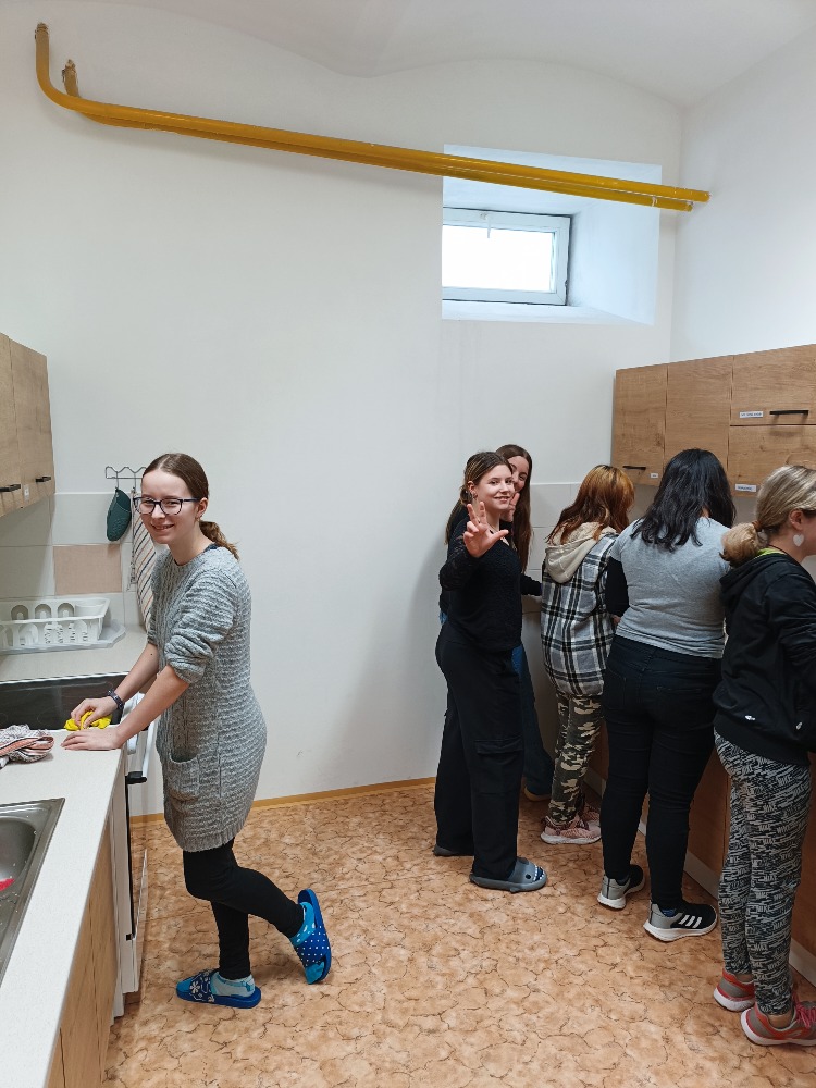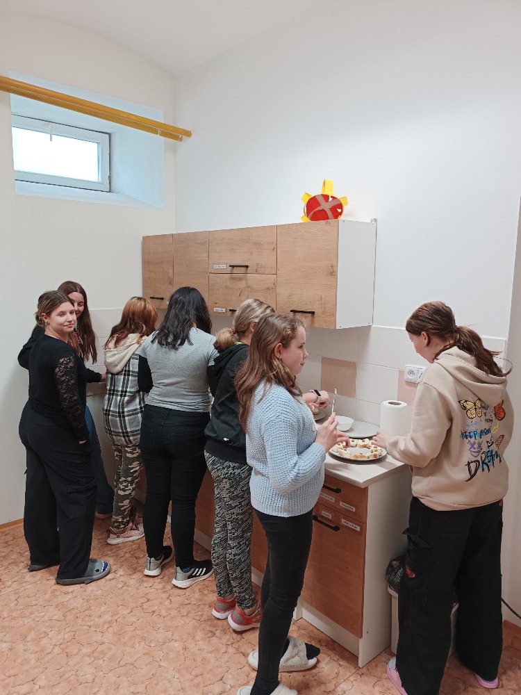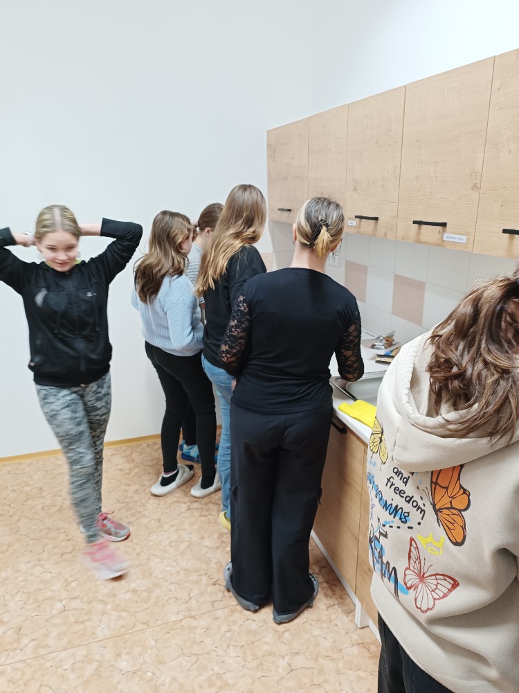 Děvčata ze šesté a sedmé třídy si vyzkoušela naši novou kuchyňku a připravila pro sebe i své spolužáky výbornou česnekovou pomazánku.