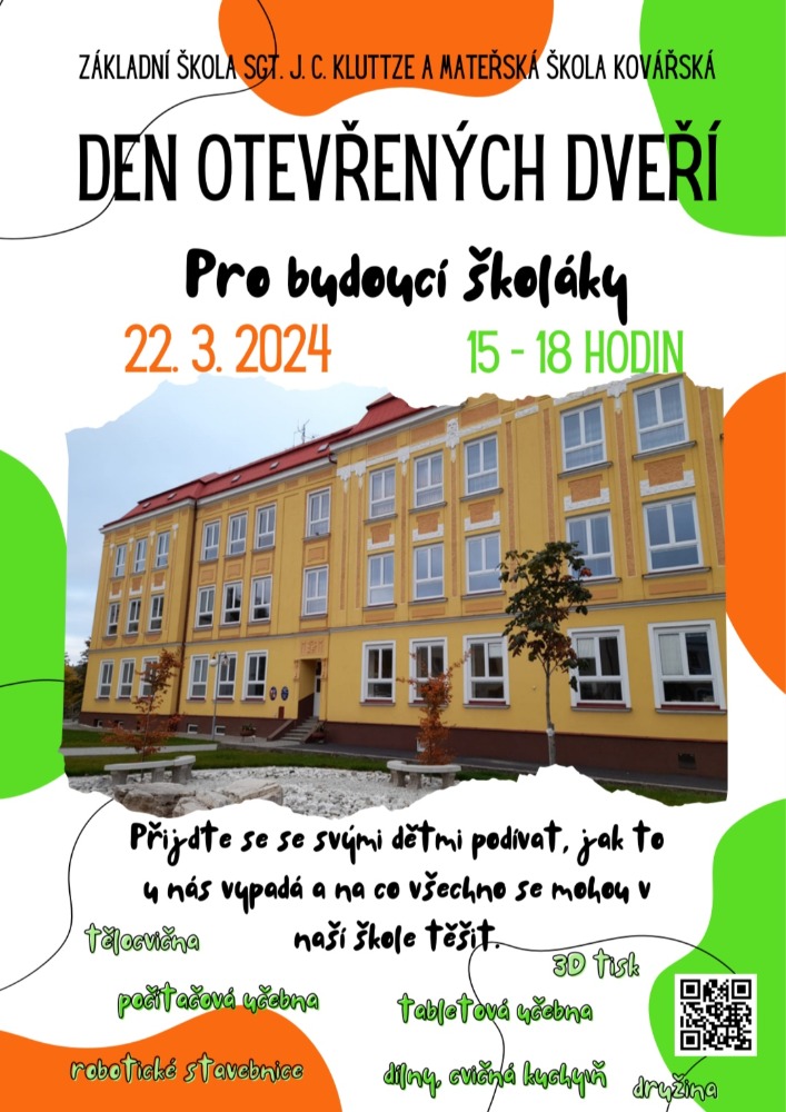 Dovolte nám, abychom vás pozvali na den otevřených dveří, který se bude konat dne 22.3.2024, od 15 hodin. Ukážeme vám nové učebny, moderní vybavení a spoustu dalšího. Těšíme se na viděnou.
