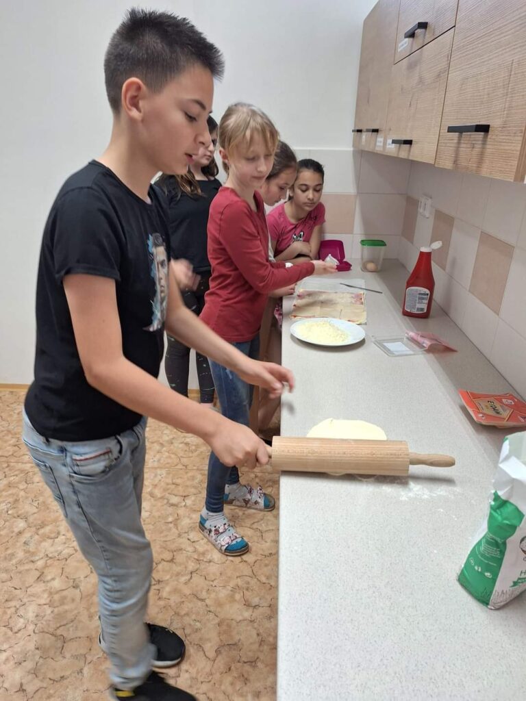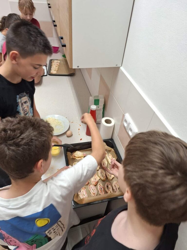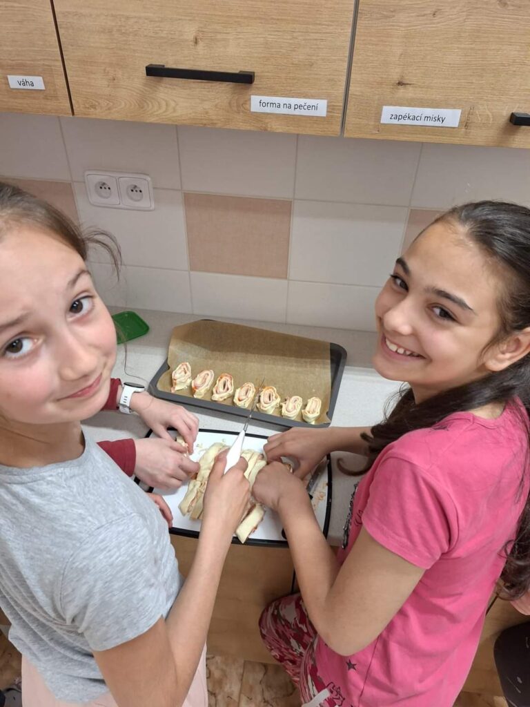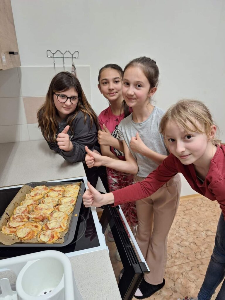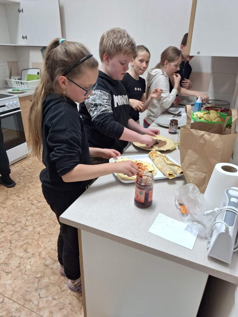 Dnes 4. a 5. třída zažila hody. První skupinka usmažila vynikající palačinky se šlehačkou a ovocem. Ti druzí měli za úkol upéct šneky z listového těsta se šunkou a sýrem. Dětem se to moc povedlo a všem chutnalo.