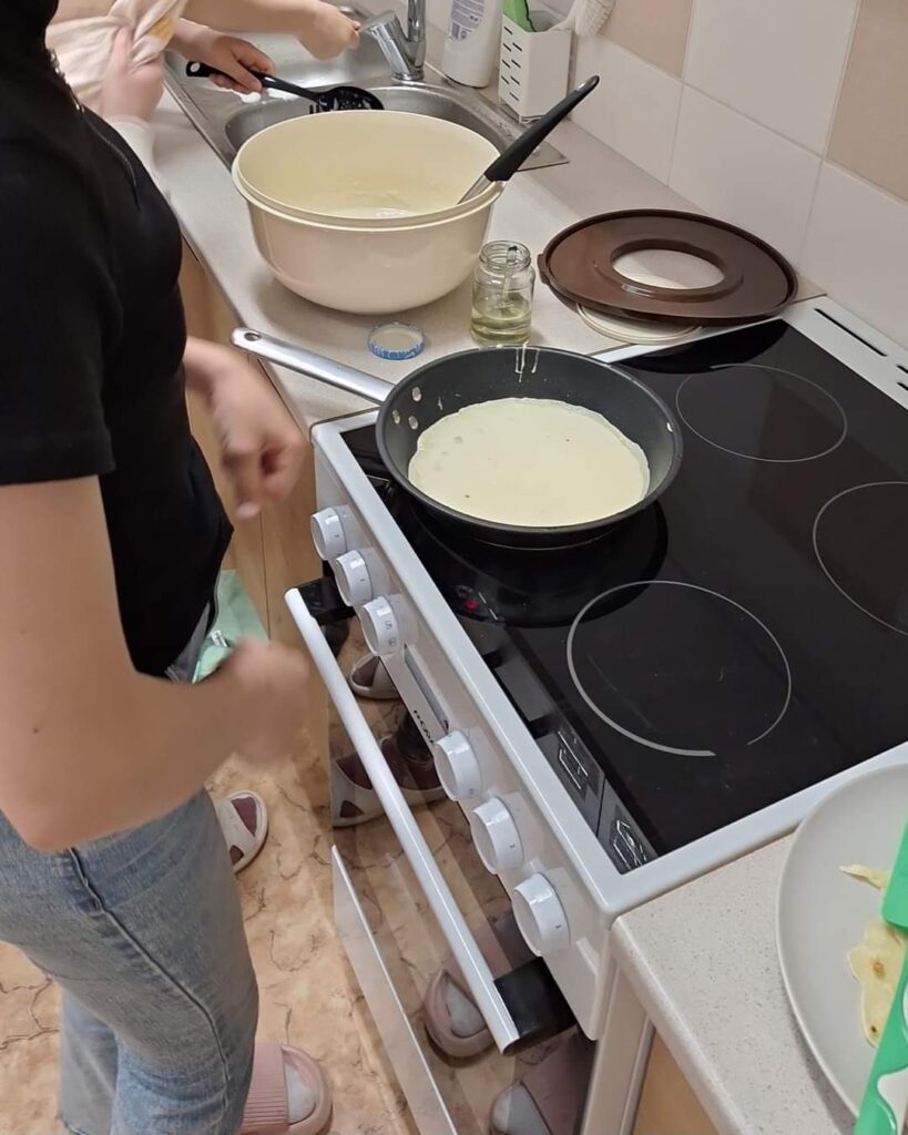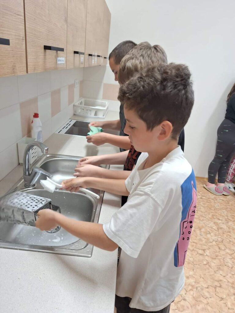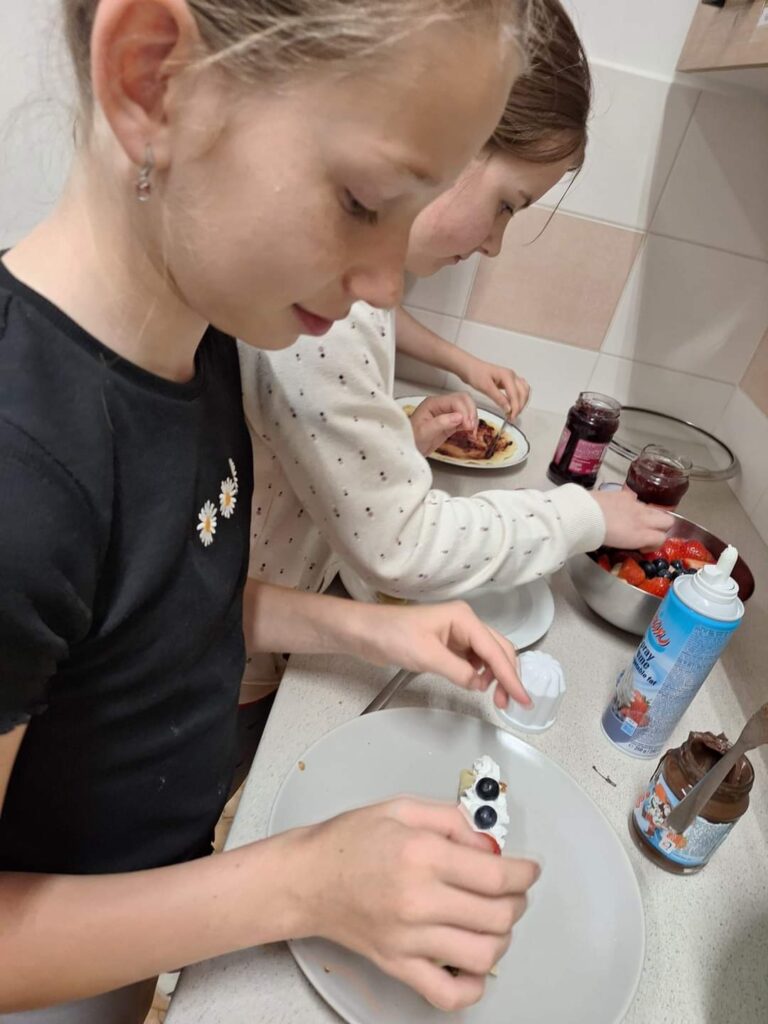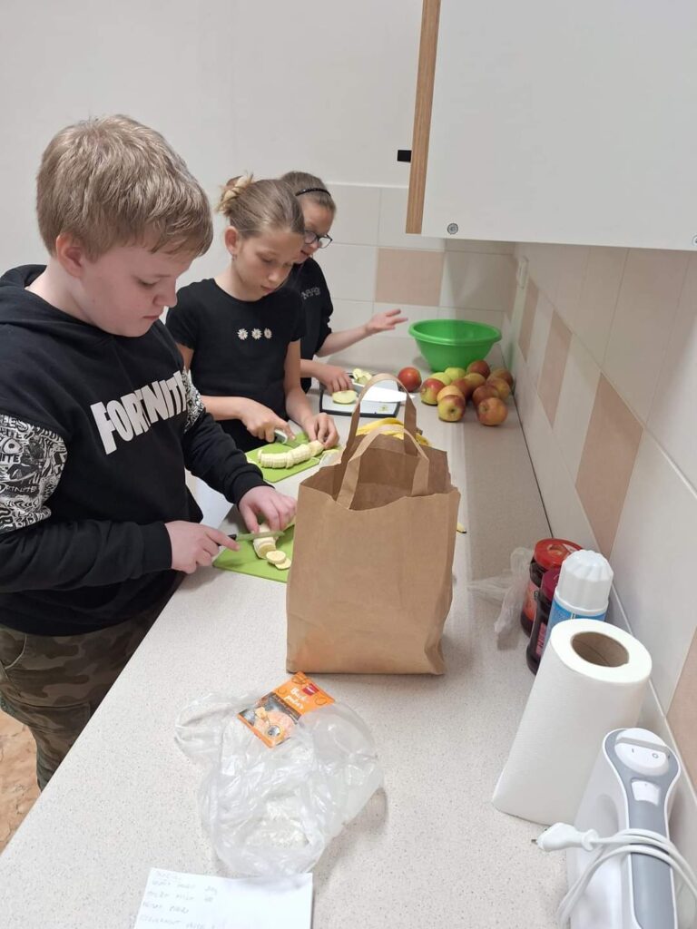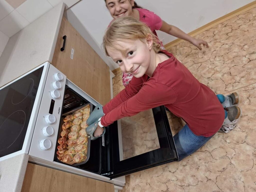 Dnes 4. a 5. třída zažila hody. První skupinka usmažila vynikající palačinky se šlehačkou a ovocem. Ti druzí měli za úkol upéct šneky z listového těsta se šunkou a sýrem. Dětem se to moc povedlo a všem chutnalo.