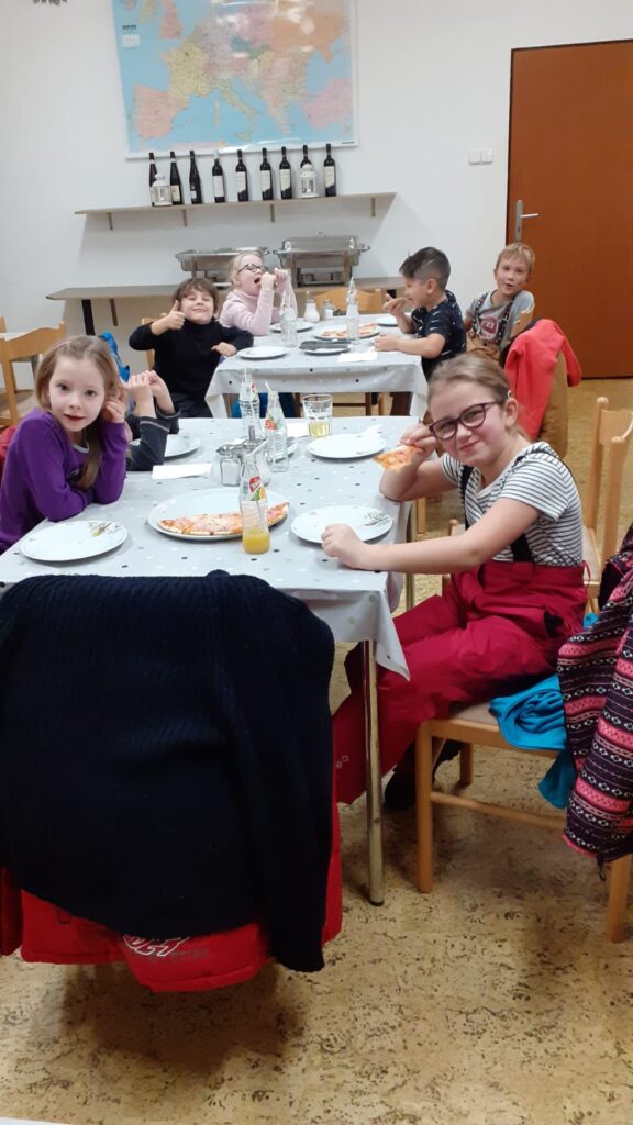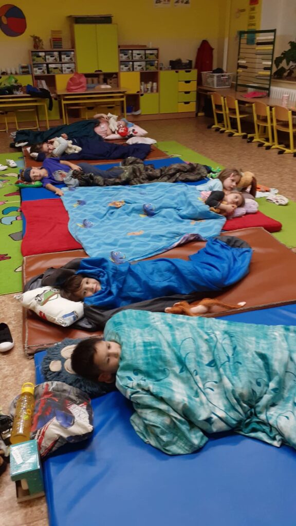 Dne 22. 12. 2021 jsme my prvňáci přespali ve své třídě. Sešli jsme se v 17:00, šli jsme odnést dobroty lesním zvířátkům a pak se jsme se vydali do penziónu Pohoda na večeři. Měli jsme pizzu a moc nám chutnala. Po večeři jsme si byli zahrát kuželky. Ani se nám nechtělo skončit, ale čas byl neúprosný. Když jsme se vrátili do školy, přichystali jsme se na spaní a ještě stihli pohádku na dobrou noc.