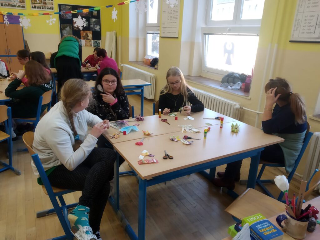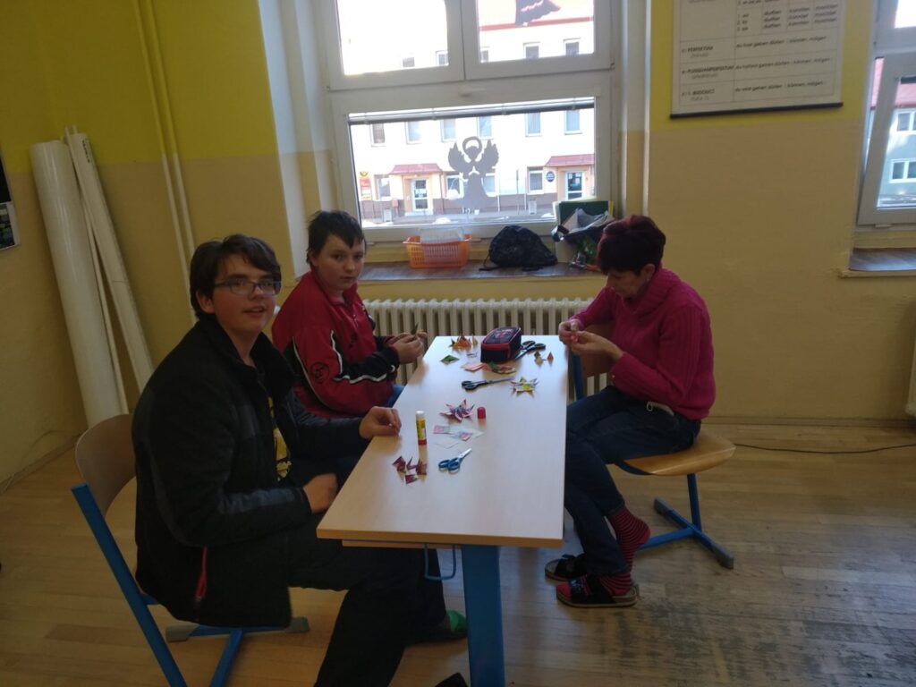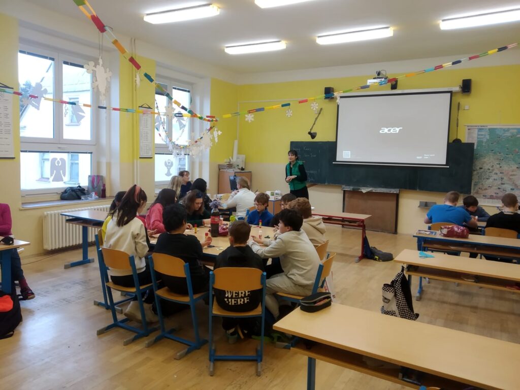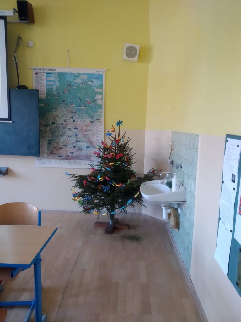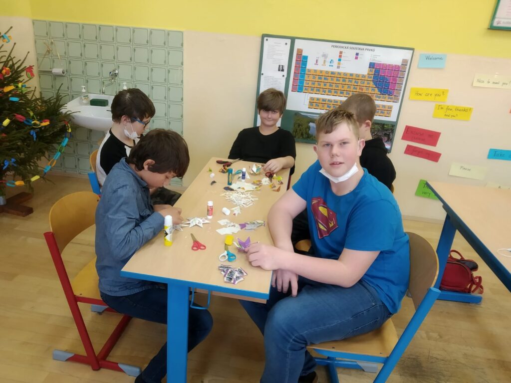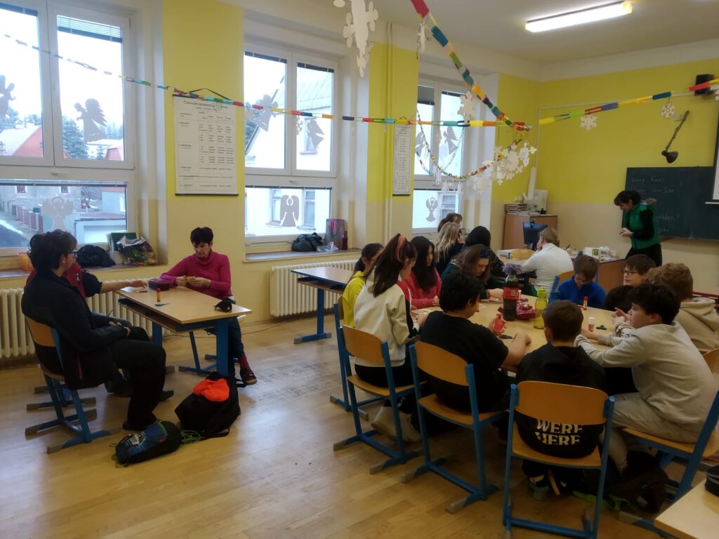 Poslední den před vánočními prázdninami se větší děti sešly a společně se pokusily vytvořit si krásné ozdobičky z čajových sáčků. Myslím, že všem se tvoření líbilo a výtvory stály za to. Každá třída pak měla svou vánoční besídku, zazpívali jsme si, pojedli vánoční cukroví a navzájem si rozdali dárečky.