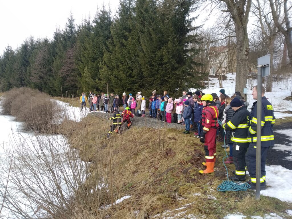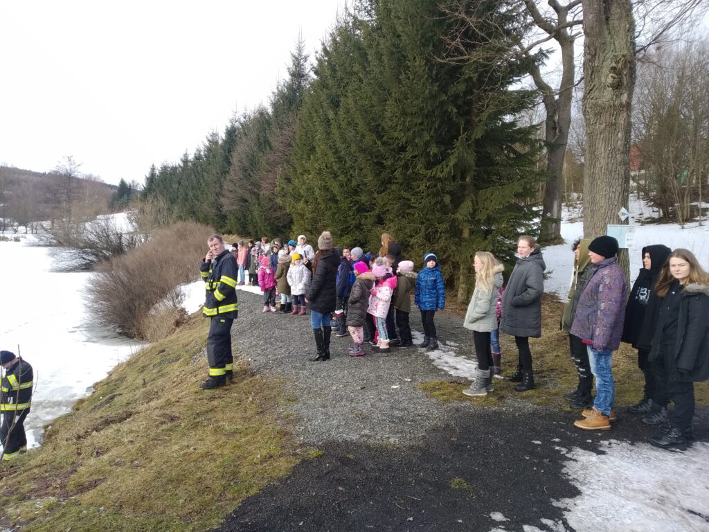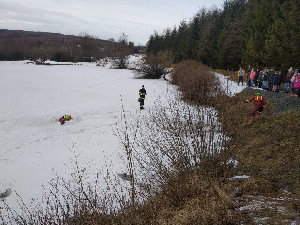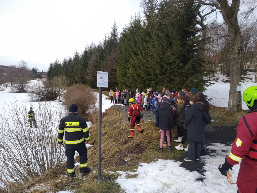 Na rybníku nedaleko školy na naše žáky čekali hasiči HZS Klášterec nad Ohří. Děti se dozvěděly, že hasiči, kromě likvidace požárů, pomáhají i při autonehodách, záchraně zvířat, při povodních a jiných záchranných akcích. A to nám právě zde předvedli. Vysvětlili dětem nebezpečí zamrzlých ledových ploch a názorně jim ukázali, jak zachraňují člověka, který se na zamrzlé ploše propadl. Všichni sledovali záchranné akce se zatajeným dechem a hasiče odměnili potleskem. Na závěr měly děti možnost vyzkoušet si záchrannou vestu a hasičské helmy. Odcházeli jsme zpět plni dojmů a nevšedních zážitků.