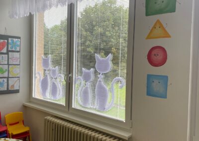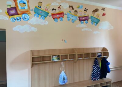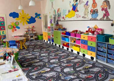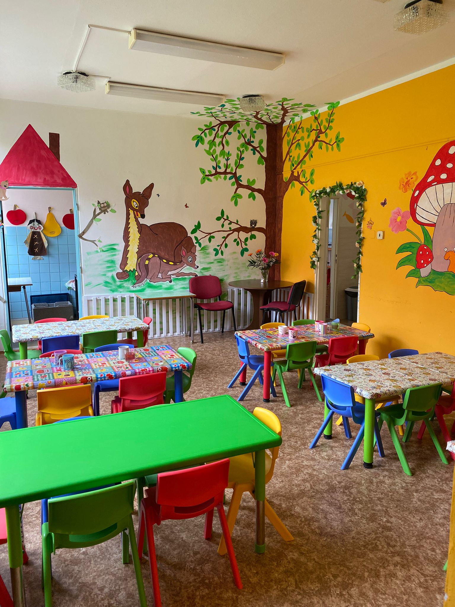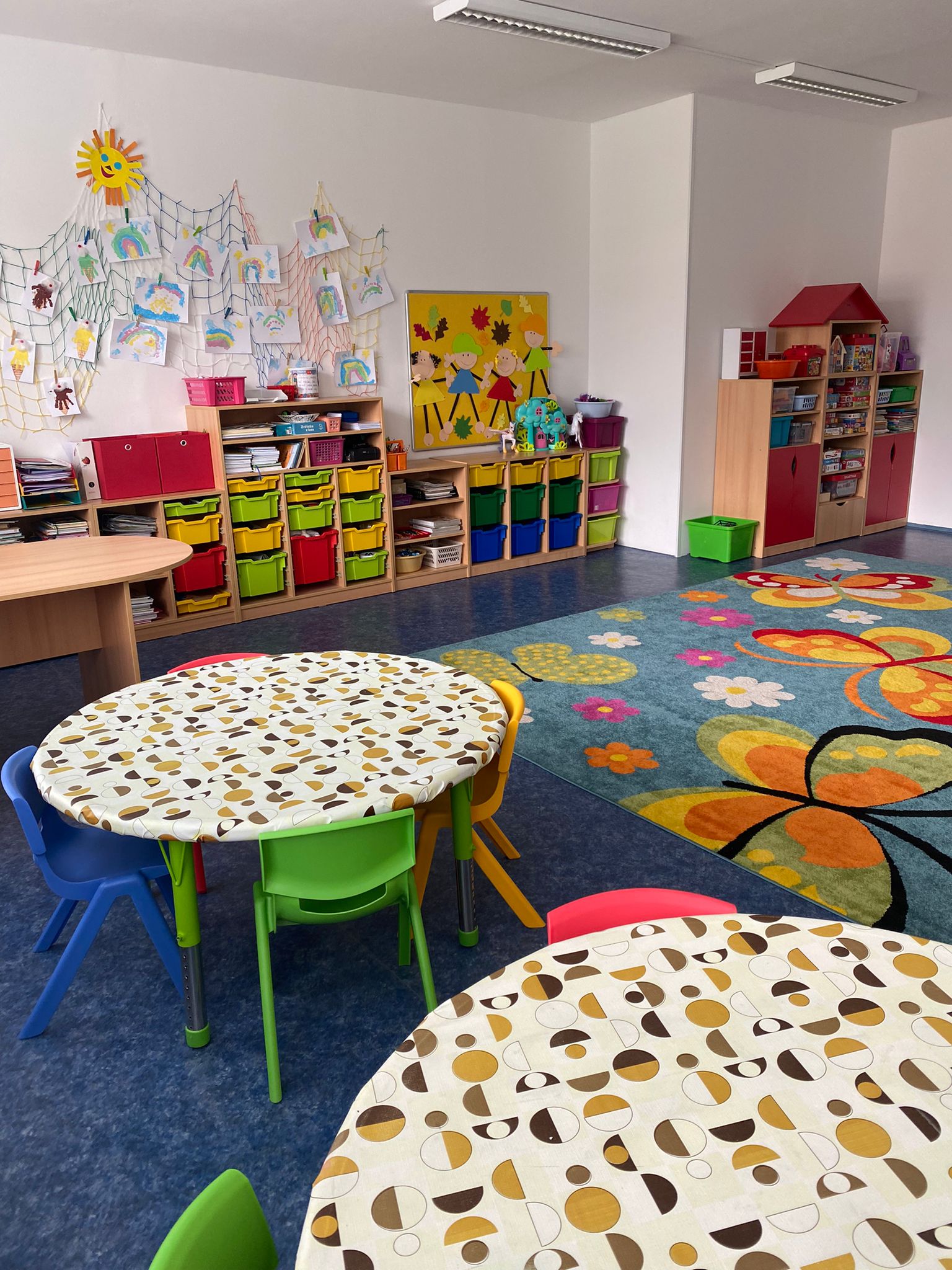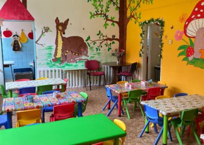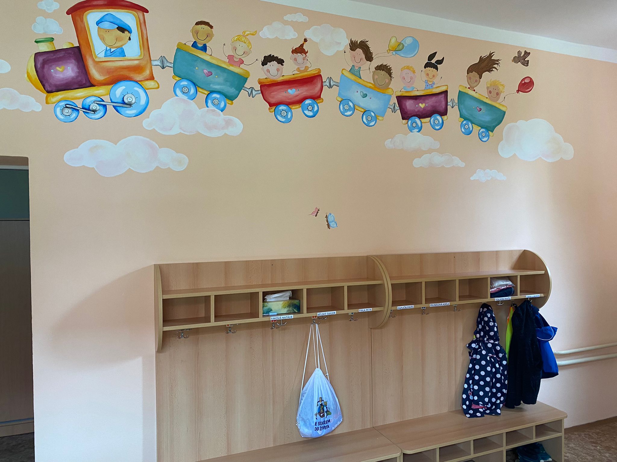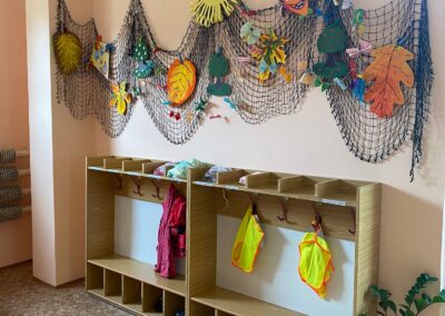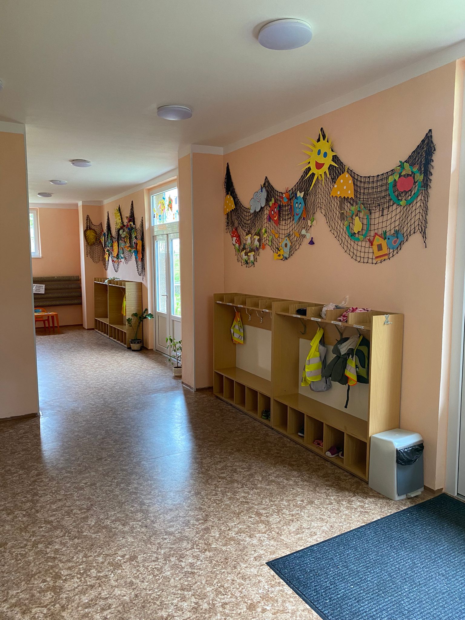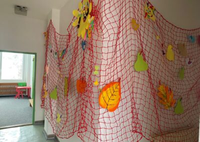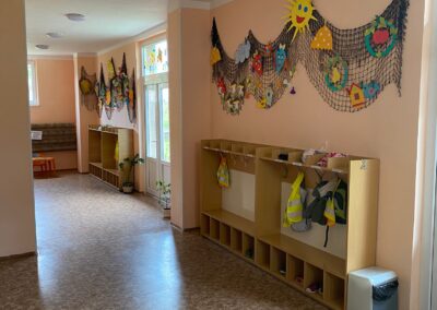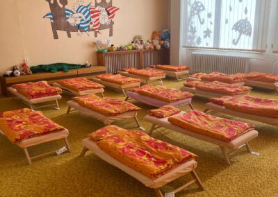 Prostory MŠ zahrnují technické zázemí a kancelář, sloužící personálu, pro potřeby dětí je zde plně vybavená šatna, jídelna, třídy,tělocvična a odpočívárna. Stravu do MŠ dovážíme v termoboxech dle hygienických norem a předpisů.
