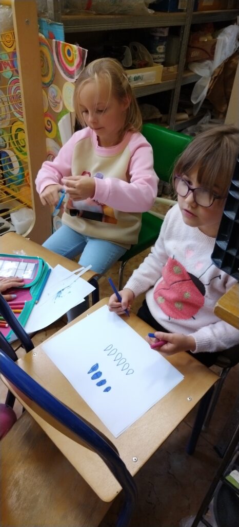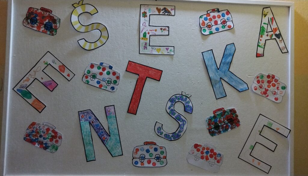 Následně jsme nástěnku obměnili výtvarnou prací, kdy si žáci vyzkoušeli tisk temperovou barvou(aktovky) a procvičili stříhání(písmenka).