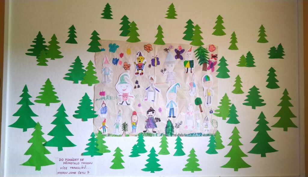 Četba pohádky O Sněhurce nás inspirovala ke kresbě trpaslíků a následné kolektivní práci na téma trpaslíci v lese.